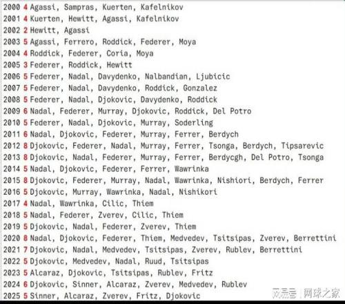 以下是2000 年以来的每个赛季,全年都位列 ATP 排名前 10 的球员人数及姓名。